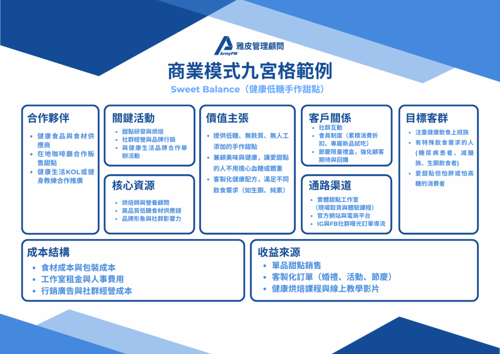 在 Sweet Balance 的九宮格範例中,整個商業模式圍繞著「低糖、健康、美味並存」的價值主張展開,精準鎖定注重健康飲食、具有特殊飲食需求以及怕胖又愛甜的族群,透過實體工作室、官網與社群平台將產品與品牌故事傳遞出去,並以會員制度、節慶禮盒強化顧客關係。