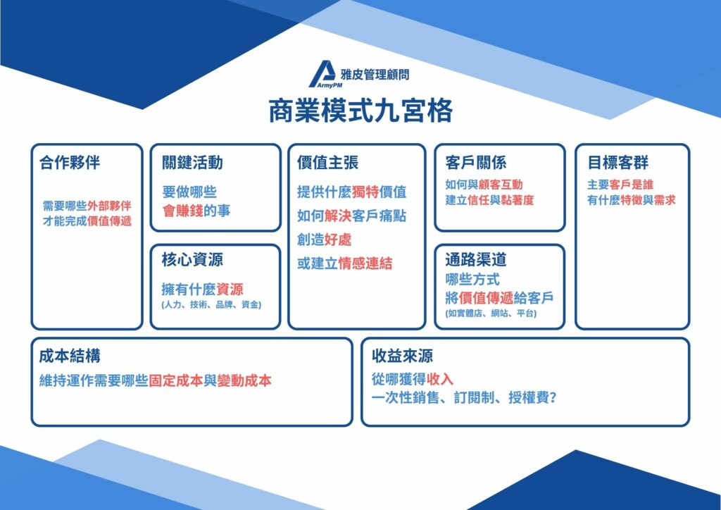 在眾多分析工具中,「商業模式九宮格」(Business Model Canvas)結構清楚、操作簡單,成為許多創業者與企業主愛用的方法。透過九個關鍵構面,你可以快速檢視自己的商業模式,並精準鎖定獨特的價值主張,讓品牌在競爭市場中脫穎而出。接下來,讓我們一步步拆解商業模式的概念,並用九宮格幫你找到那個最能打動客戶的核心價值。